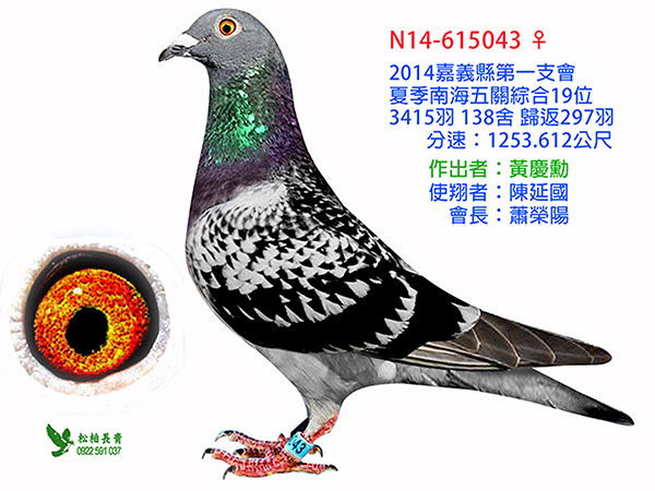 直孫14-615043班母,獲得嘉義縣第一支會夏季3.415羽五關綜合19位。