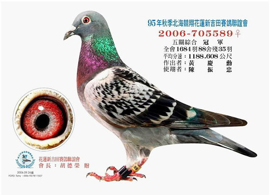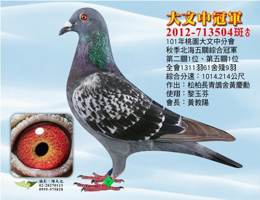母鴿:舊腳環513301 班母,"大文中綜合冠軍"全妹,為本舍超級種鴿"小迪克879"直女。