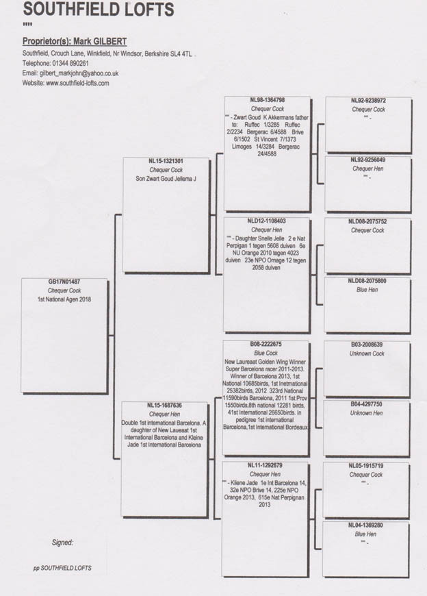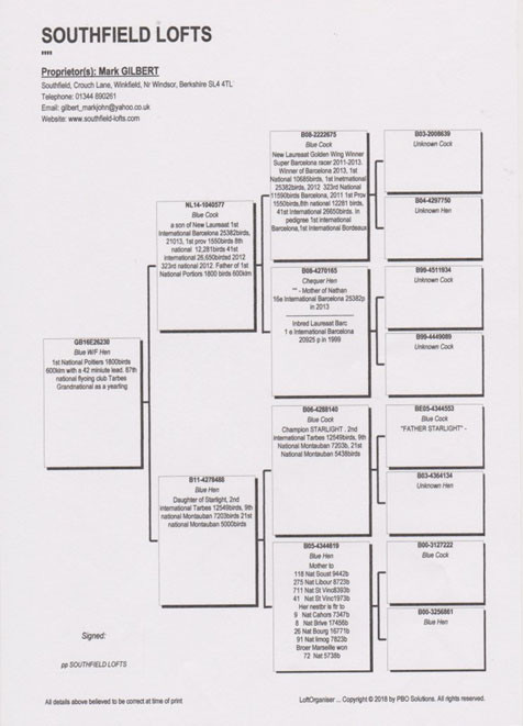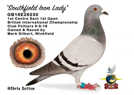 這羽雌鴿名為“南方鐵娘子”(Southfield Iron Lady GB16E-26230灰母),其父親NL14-1040577灰公為路克.威爾斯(Luc Wiels)的巴賽隆納國際冠軍“新榮耀號B08-2222675灰白羽.公.”的直子,母親B11-4278488灰母為倚天.梅爾浪的塔碧斯國際賽亞軍“星光”(Starlight)直女。這羽雌鴿擁有優秀獲