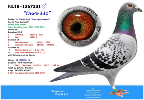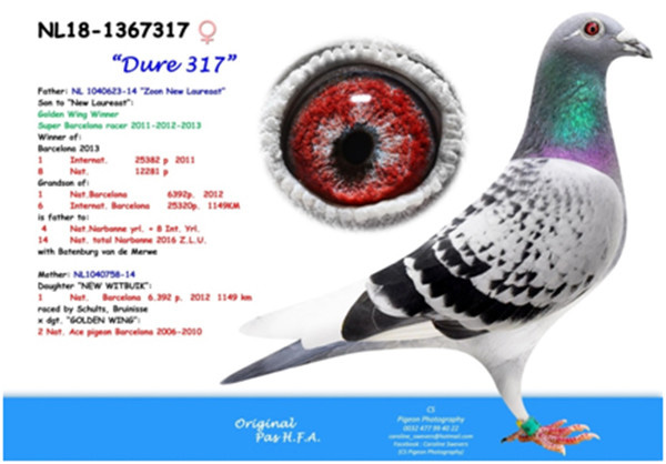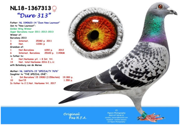 母鴿:NL14-3420857斑母,2017年巴塞隆納國際17.094羽總冠軍”蘇美爾戰將” (歷年來最艱難的一次巴塞隆納國際賽)直女。