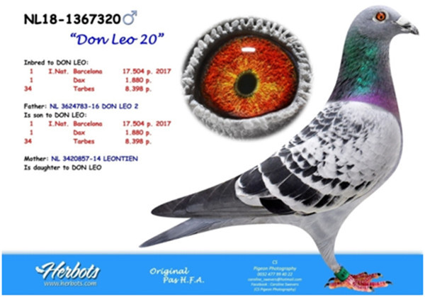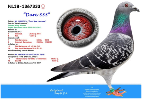 母鴿:NL14-1040758斑母,2012年巴賽隆納全國6,393羽冠軍1,149公里,國際25,438羽6位直女。