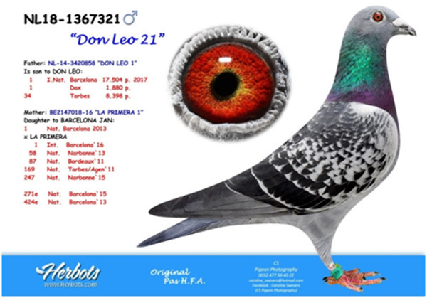 父鴿:NL16-3624783斑公,2017年巴塞隆納國際17.094羽總冠軍”蘇美爾戰將”(歷年來最艱難的一次巴塞隆納國際賽)直仔。