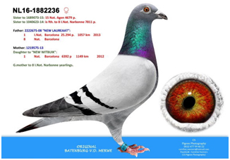2019年7月6日巴塞隆納國際賽16.051羽13位(荷蘭全國5位)是”新榮耀號”直孫女!NL16-1508442灰白羽.母 黃眼。