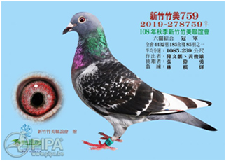 二、2019年新竹竹美聯誼會秋季4.432羽六關綜合冠軍19-278759斑白羽.母,全會殘存85羽。(新榮耀直孫X小迪克879直女),陳文麟、黃俊雄作出。