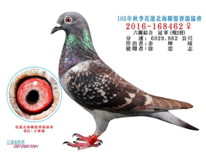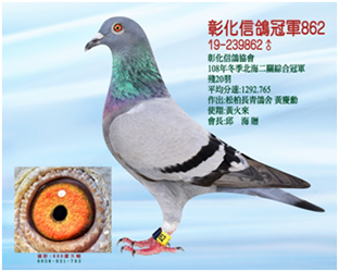 五、2019年彰化信鴿協會冬季賽(全會殘存20羽),綜合冠軍19-239862灰公,是”新榮耀號279” NL17-1262279灰公(新榮耀號近親)作出。