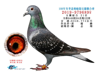 八、2019年宜蘭聯合會冬季賽(全會6.448羽剩下122羽)綜合21位 19-979689斑母(李耀民)考布曼阿拉丁家族近親作出。