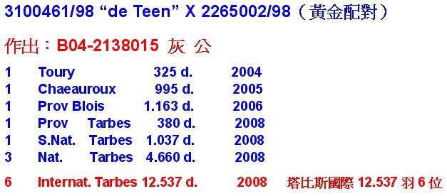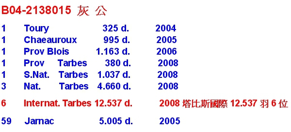 B04-2138015灰公,”黃金配對”直子,入賞5次冠軍、2008年塔比斯933公里國際12.537羽6位,