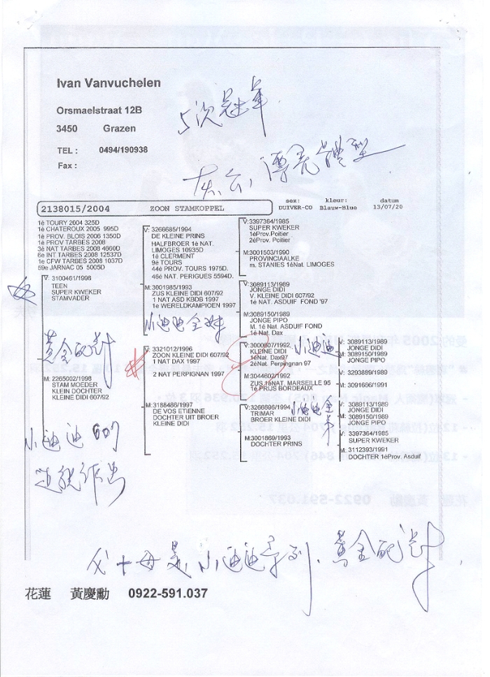 父鴿:B06-2263993 比利時倚天.迪沃斯世界名鴿小迪迪(Kleine Didi)KBDB全國長距離鴿王冠軍四度近親後代,自Van Vuchelen Ivan伊凡.范奇楠鴿舍引進。