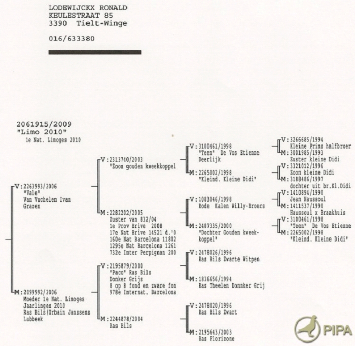 Also in 2010 grandfather from 1st National Limoges yearling 14.199 pigeons, is a brother of this pigeon
