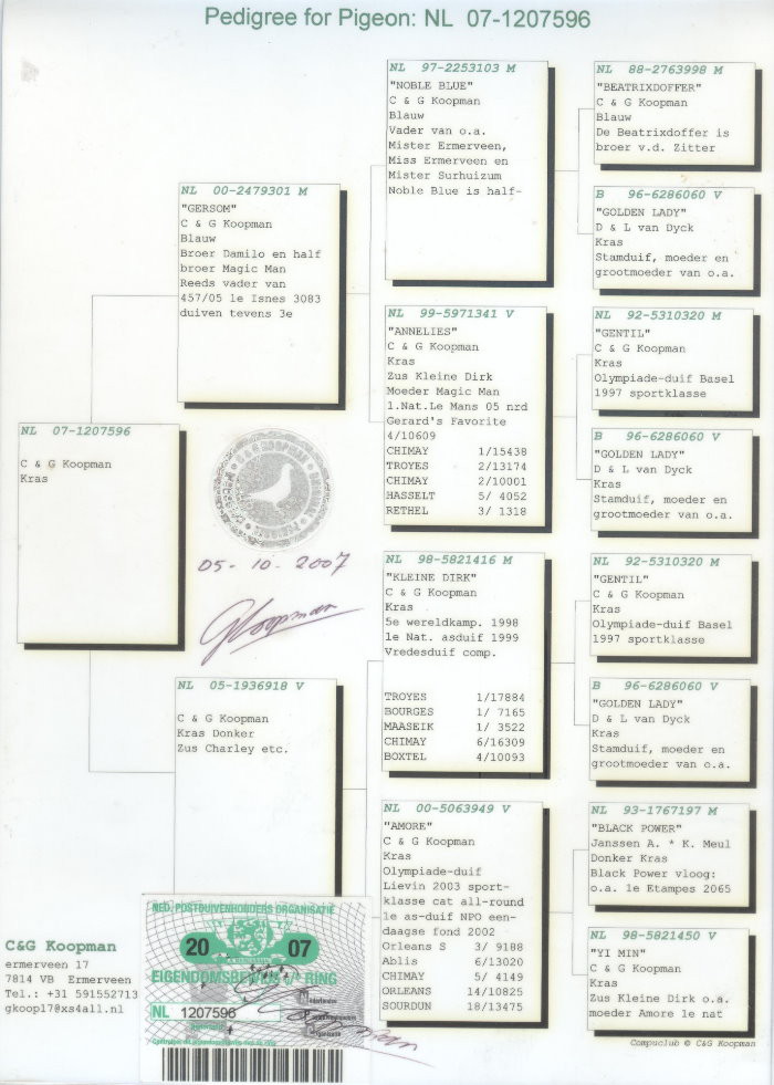 1、直仔:NL04-4155907荷蘭W.H.Z.B.2007年全國雄鴿王冠軍。