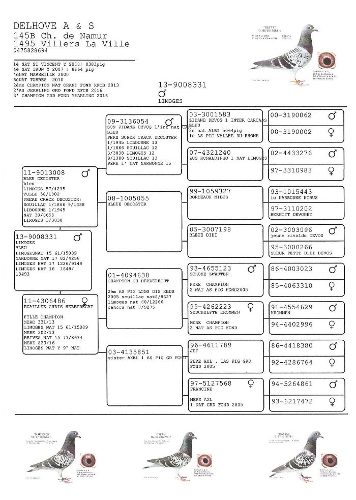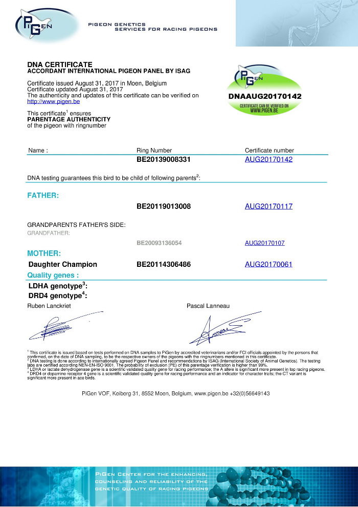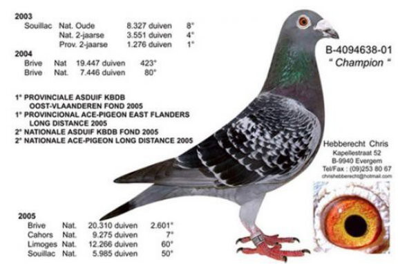 母親:"冠軍號直女"(Daughter Champion),克利斯.赫博瑞原舍鴿,出自他們的"冠軍號"X"飛斧號全姐妹"。"冠軍號"榮獲2005年KBDB全國長距離鴿王亞軍,卡奧爾全國9,275羽7位,蘇雅克全國8,327羽8位,以及利蒙治全國12,266羽60位等等。"飛斧號"榮獲2005年KBDB全國超長距離鴿王冠軍。