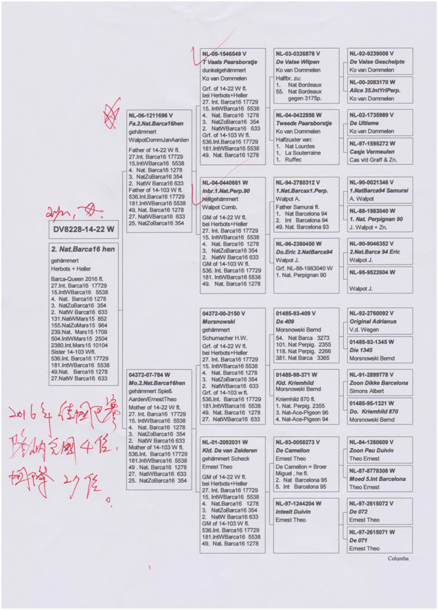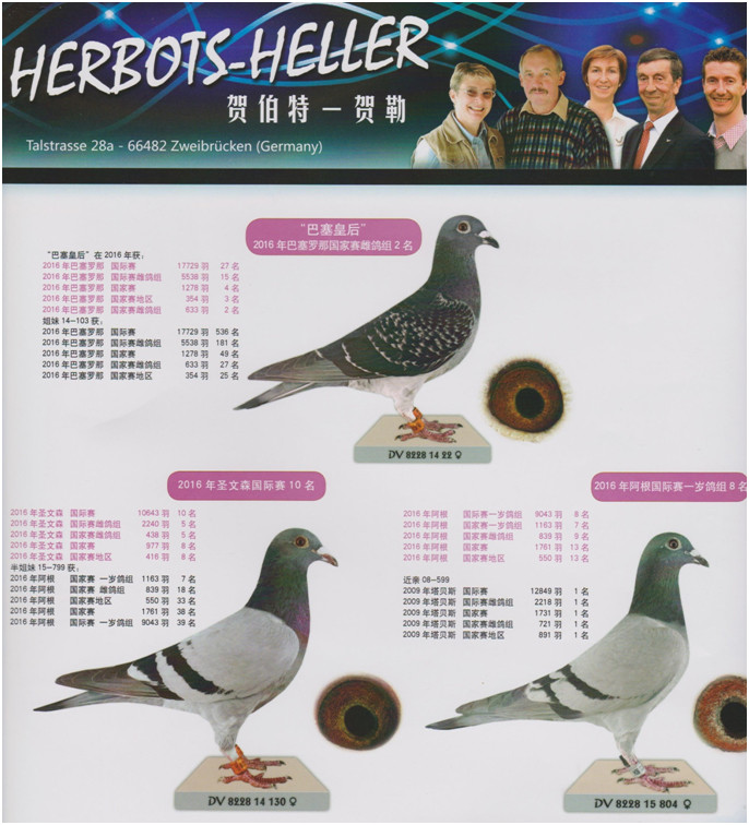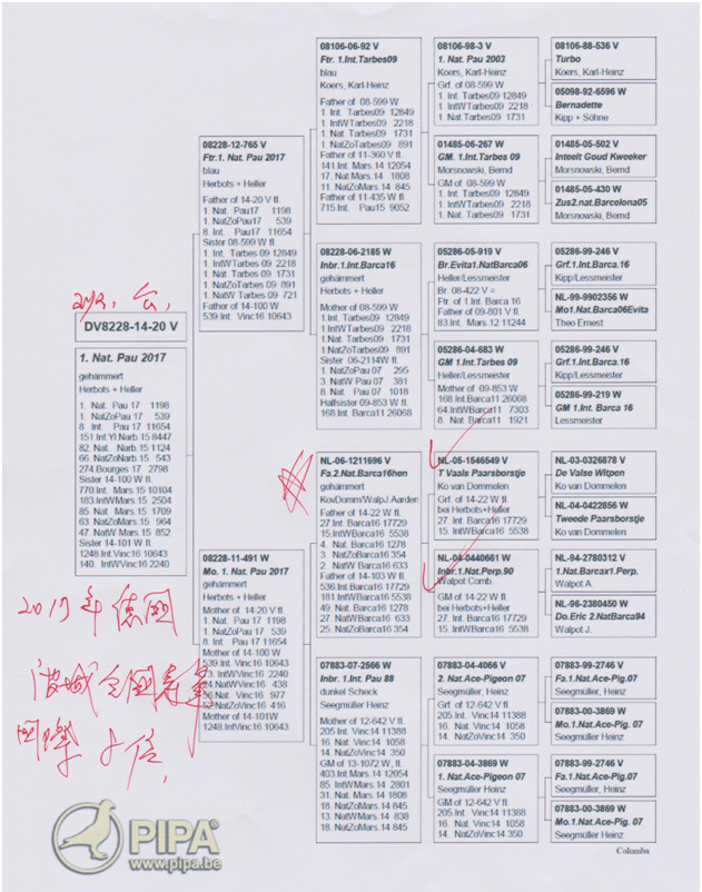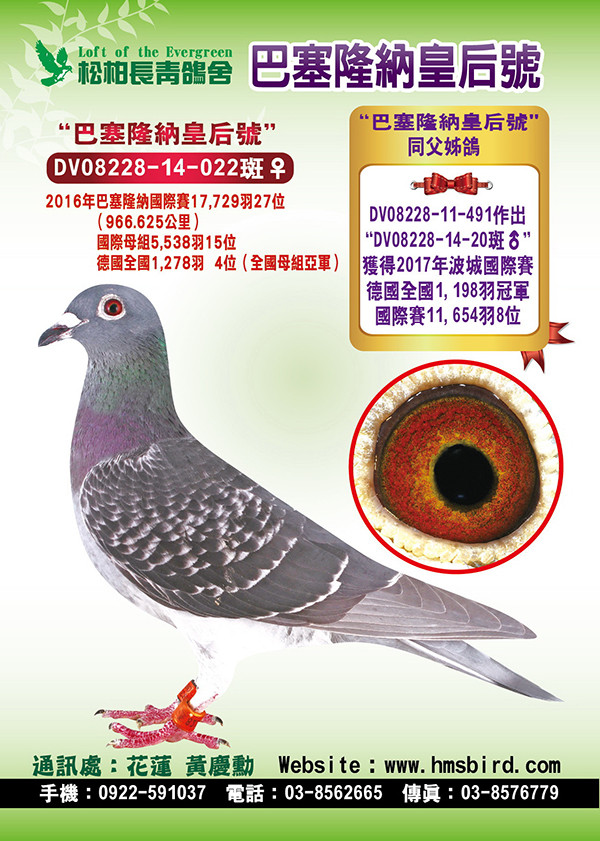 “巴塞隆納皇后號”的同父姊鴿DV08228-11-491作出,“DV08228-14-20班公,獲得2017年波城國際賽德國全國1.198羽冠軍,國際賽11.654羽8位。