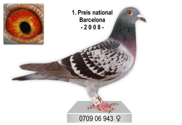 母鴿:DV0709-06-943班母,2008年巴塞隆納德國全國冠軍,國際23.708羽18位(950公里)。