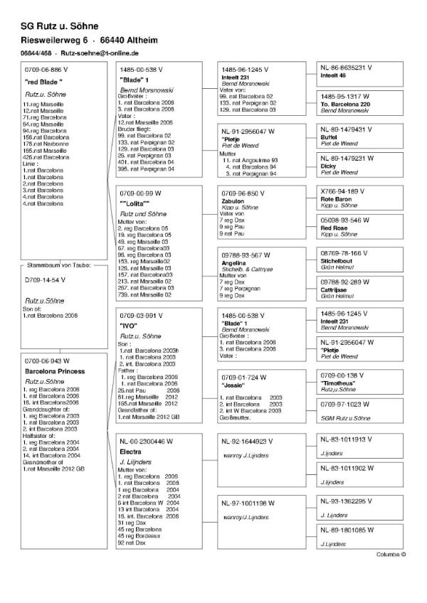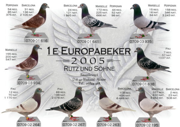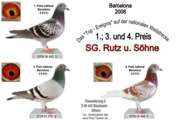2008年巴塞隆納國際賽,德國魯茲父子鴿舍獲得德國全國1、3、4位(950公里)。