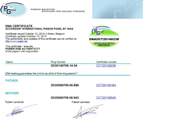 "德國魯茲54" DV0709-14-54 紅公 DNA檢驗證明書