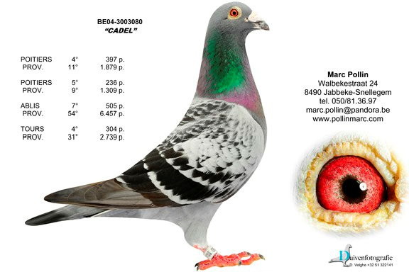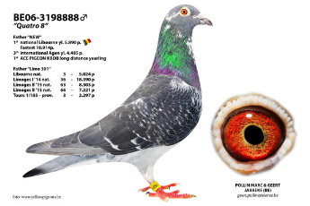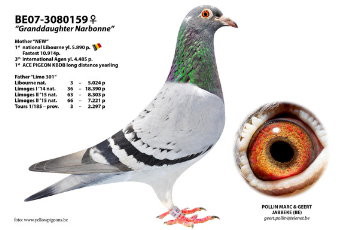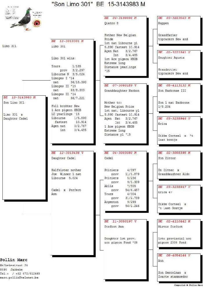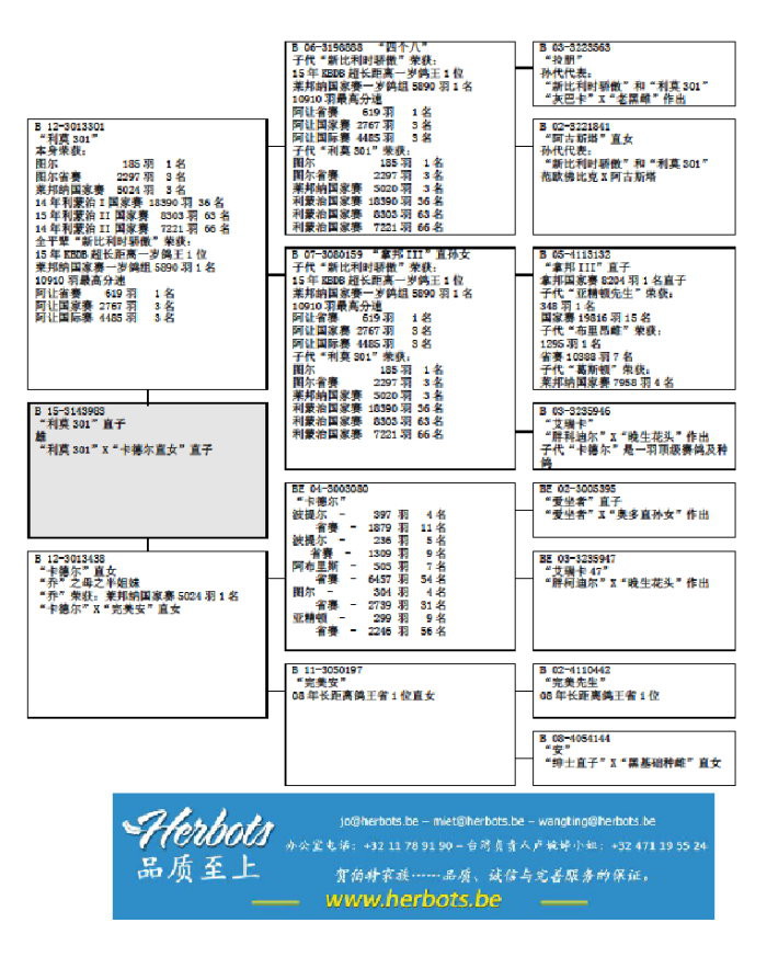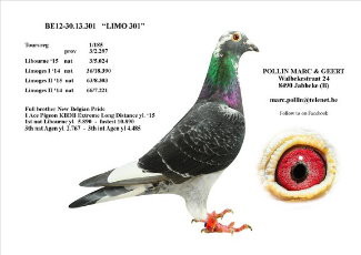 父鴿:B12-3013301 班白羽 公 "利莫301",入賞2014年利蒙治I全國18.390羽36位、利蒙治II全國7.221羽66位、2015年利蒙治II全國8.303羽63位、萊邦納全國5.024羽3位、杜爾斯省賽2.297羽3位等。