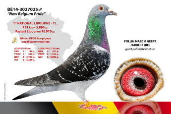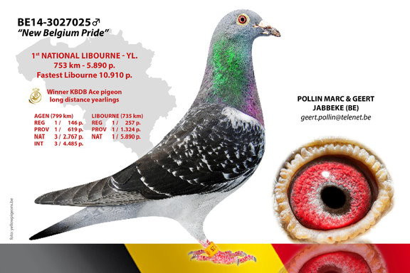 其全弟B14-3027025班公,"新比利時驕傲"獲得2015年比利時K.B.D.B.超長距離一歲鴿全國鴿王冠軍,