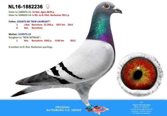 —父親出自吉塞布賴特的傳奇大銘鴿"巴賽隆納榮耀號"B92-4428350灰白羽公的一羽直孫女,"巴賽隆納榮耀號"榮獲: