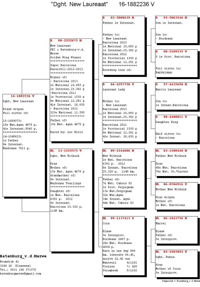 2012年巴賽隆納荷蘭國家賽6.392羽全國冠軍、國際賽25.320羽6位。其作出直仔.女入賞卡奧爾全國7位,培品納全國13位,阿讓全國32位,阿讓國際34位,卡奧爾全國44位,是雨果•巴滕柏格舍內超級種鴿。