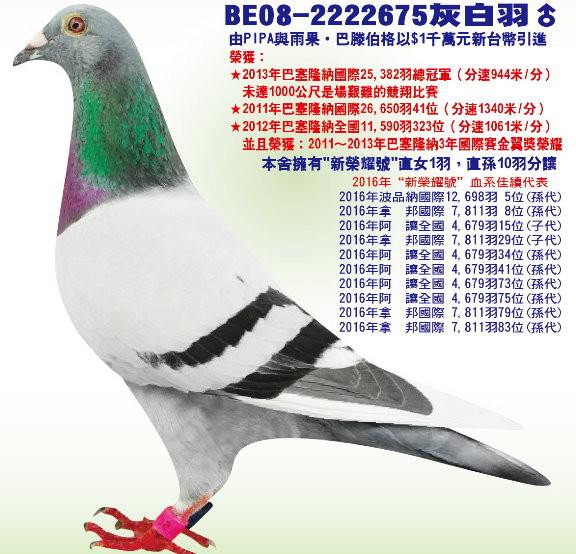 父鴿: B08-2222675灰白羽 公由PIPA與雨果•巴滕伯格聯合引進(盧克•威爾斯使翔)