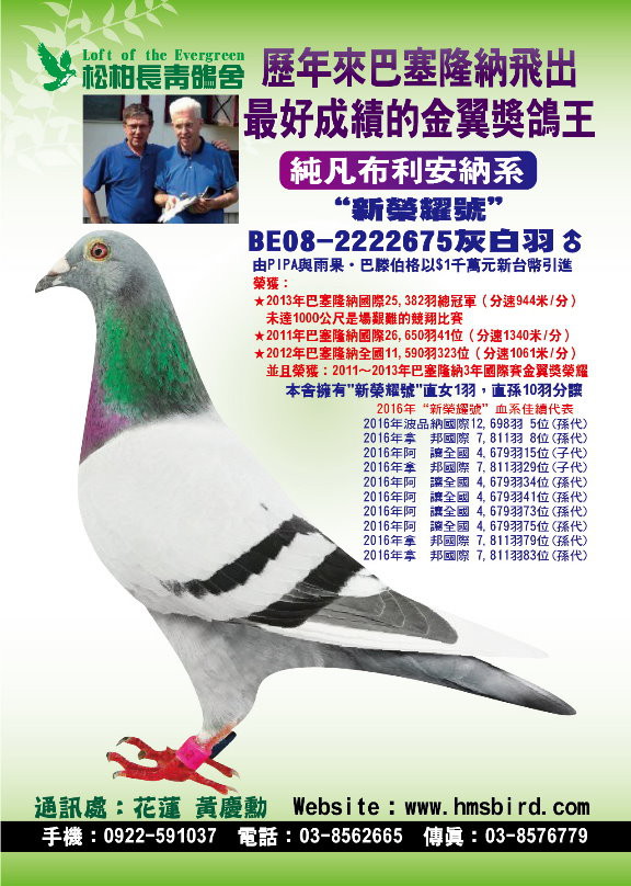 父鴿:BE08-2222675 "新榮耀號" 血統書