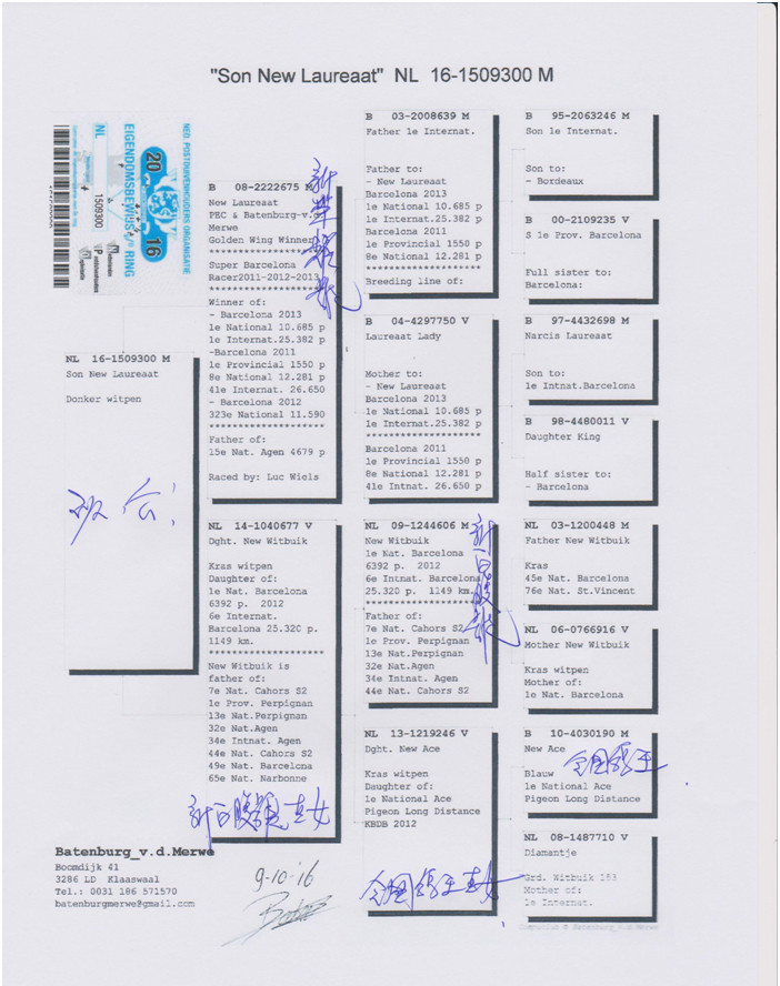 父親是2013年巴賽隆納國際冠軍,母親是巴賽隆納國際6位直女,出自荷蘭馬拉松最佳鴿舍菁英血系。