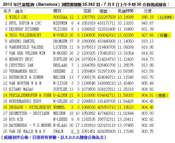 2013年巴賽隆納國際25.382羽總冠軍(分速944米/分)未達1000公尺是場艱難的競翔比賽。