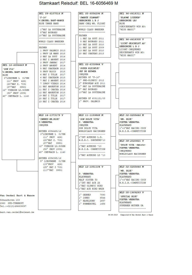 2011年比利時拉索特年全國賽20.124羽,由巴特.范歐特.南希(Van Oeckel Bart &Nance)夫婦贏得,此羽冠軍鴿B09-6107016灰公(F16),歸返時間15:10:35秒,空距620公里分速1548.258公尺。