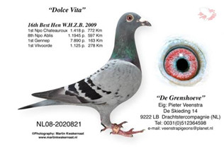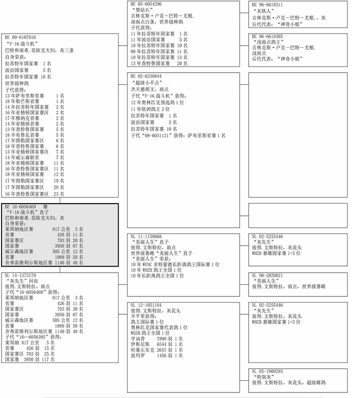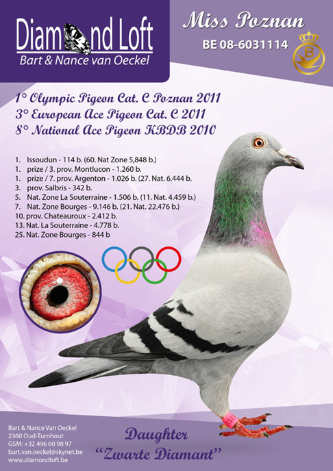 其直女B08-6031114灰母(Miss Poznan)波茲南小姐-一獲得2011年波蘭波茲南奧林匹克比利時長距離鴿王冠軍代表鴿,隔年同父異母半弟鴿B09-6107016灰公(F16),即是此次拉索特年全國總數20.124羽總冠軍鴿。