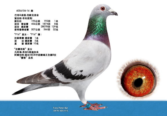 作出直女B08-6031114(Miss Poznan)波茲南小姐-一獲得2011年波蘭波茲南奧林匹克比利時長距離鴿王冠軍代表鴿,同父異母半弟鴿B09-6107016灰公(F16),即是此次拉索特年全國總數20.124羽總冠軍鴿。