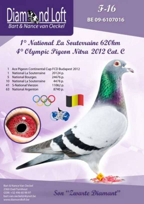 2011年比利時拉索特年全國賽20.124羽,由巴特.范歐特.南希(Van Oeckel Bart &Nance)夫婦贏得,此羽冠軍鴿B09-6107016灰公(F16),歸返時間15:10:35秒,空距620公里分速1548.258公尺。