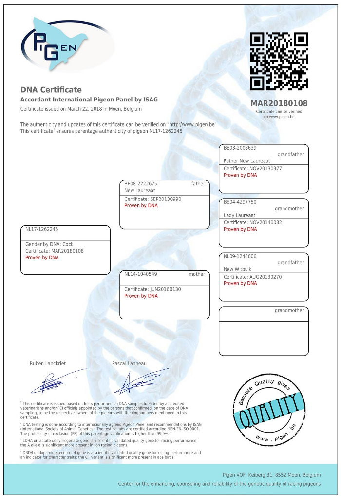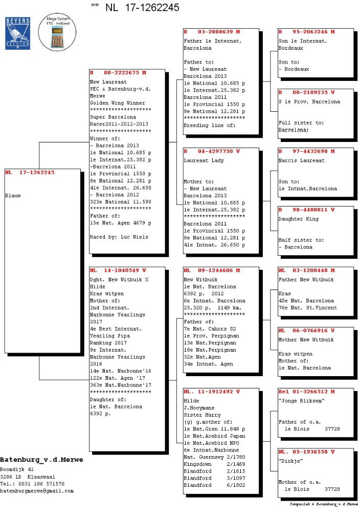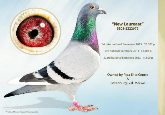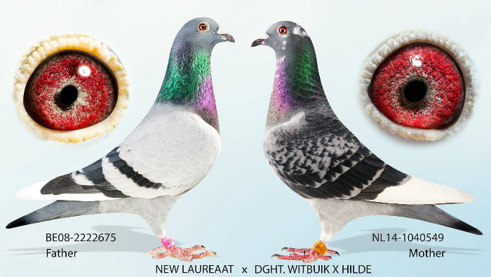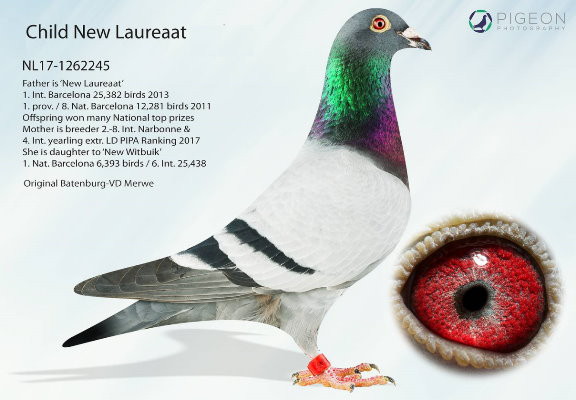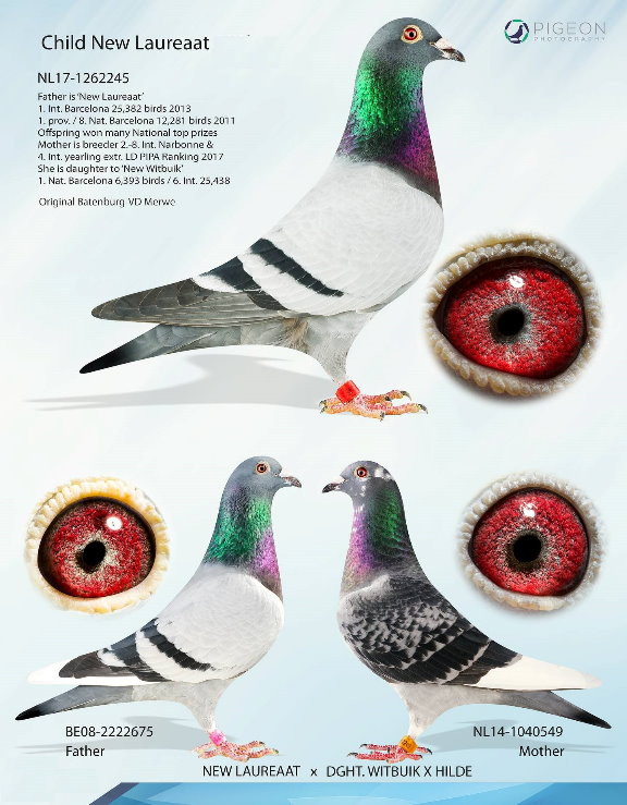 —其母親B04-4297750 "榮耀女士"出自吉塞布賴特的傳奇大銘鴿"巴賽隆納榮耀號"B92-4428350灰白羽公的一羽直孫女,"巴賽隆納榮耀號"榮獲:1995年巴賽隆納國際20.925羽冠軍。