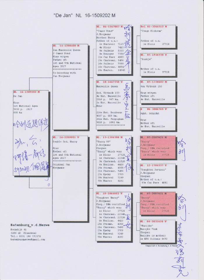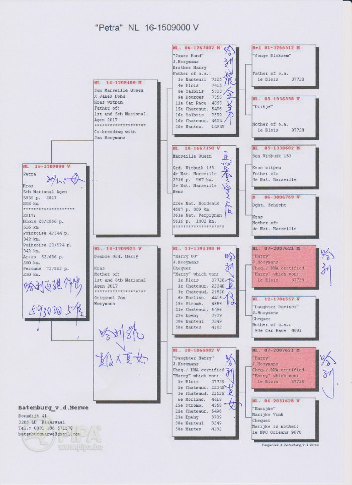 "楊"NL16-1509202班公 及他的全姐妹"佩特拉"NL16-1509000班母的表現非常搶眼。"佩特拉"的雨果的第二指定鴿,她是阿讓賽此前幾次比賽中每場最快的鴿子之一。她的祖父是"詹姆斯.邦德"(James Bond)市1羽頂尖種公,是胡曼斯標誌種公"哈利"之全兄弟。她的祖母是"馬賽皇后",曾獲得馬賽全國雌鴿亞軍和馬賽全國4位,是巴騰伯格標誌銘鴿"白腹153號"(Witbuik 153)之孫代 。