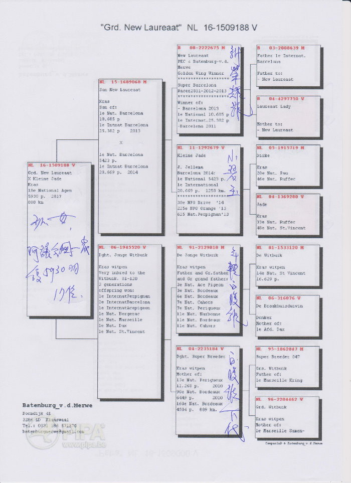 "佩特拉"NL16-1509000班母,2017年阿讓全國一歲鴿5.930羽5位 (點擊此處,查看其血統書)