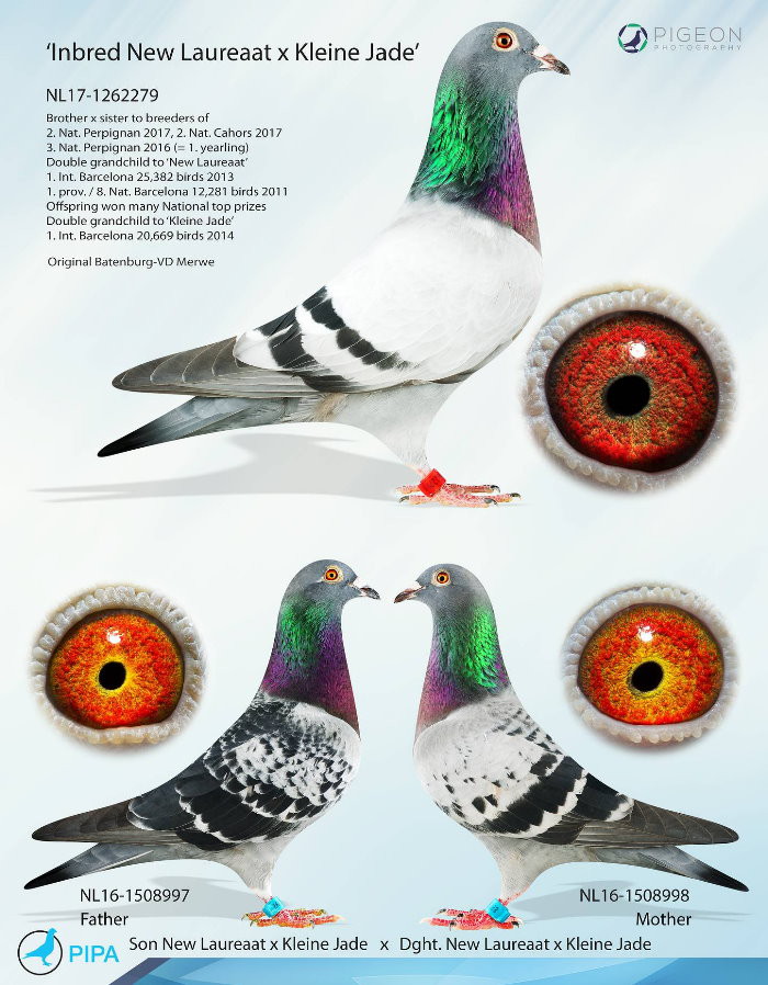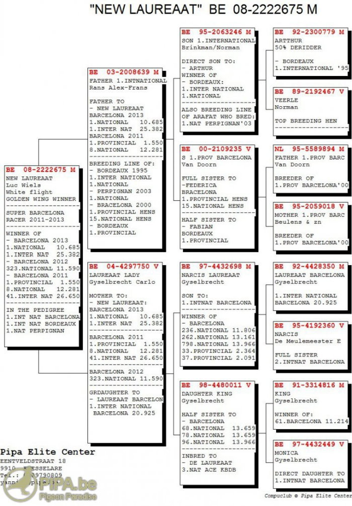 這羽"迪亞哥巴賽隆納號"在上籠的時候,已經很好地收到激勵了。事實上,盧克的一位朋友說過:這羽鴿子看起來很棒,他的狀態已經很好了。他看起來乾淨俐落還很機敏,是一羽正處在很好狀態的鴿子。說實話,可能你不會感到驚訝,這種類型的鴿子在鴿友中非常受歡迎。他獲得了許多頂級獎項,也擁有很好的血統。他的父親是亞曆克斯.蘭斯(Alex Rans)鴿舍的1995年波爾多國際冠軍"亞瑟"(Arthur)的血系。母親是卡羅.吉賽布賴特(Dr. Carlo Gijselbrecht)鴿舍的1995年巴賽隆納國際冠軍"巴賽隆納榮耀號"(Laureaat)的孫代。