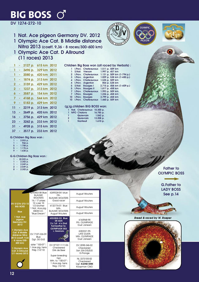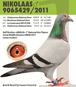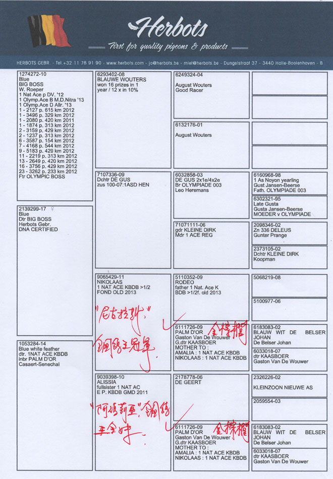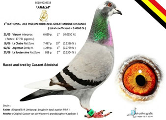 2013年比利時K.B.D.B全國中長距離鴿王冠軍。 2011年比利時K.B.D.B全國大中距離鴿王冠軍。