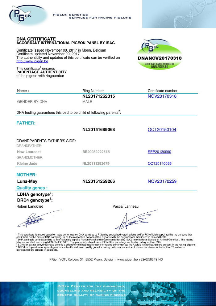 "新榮耀號315" NL17-1262315灰公 D.N.A.檢驗證明書
