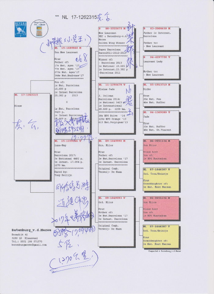父鴿:NL15-1689068班公 + 母鴿:NL15-1259266班母
