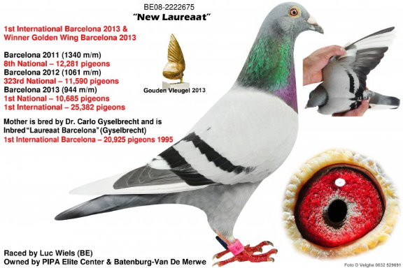 獲得2013年巴賽隆納國際賽總冠軍為來自比利時羅斯達爾(Roosdaal)區的盧克.威爾斯(Luc Wiels)鴿舍,該舍冠軍鴿"迪亞哥巴賽隆納號"(Diego Barca)B08-2222675是一羽5歲(2008年腳環)的灰白羽公鴿,在這場可以算是近10年來,最公平且艱難的巴賽隆納國際賽上,"迪亞哥巴賽隆納號"一舉擊敗25,382羽參賽鴿,問鼎巴賽隆納國際賽總冠軍。