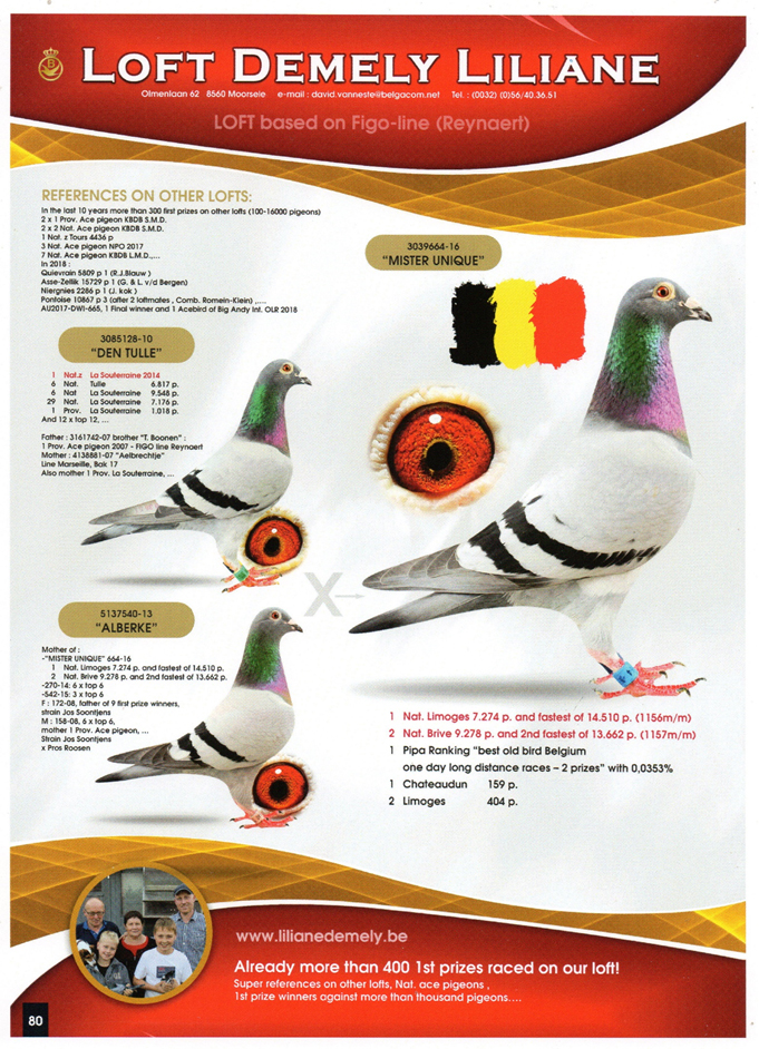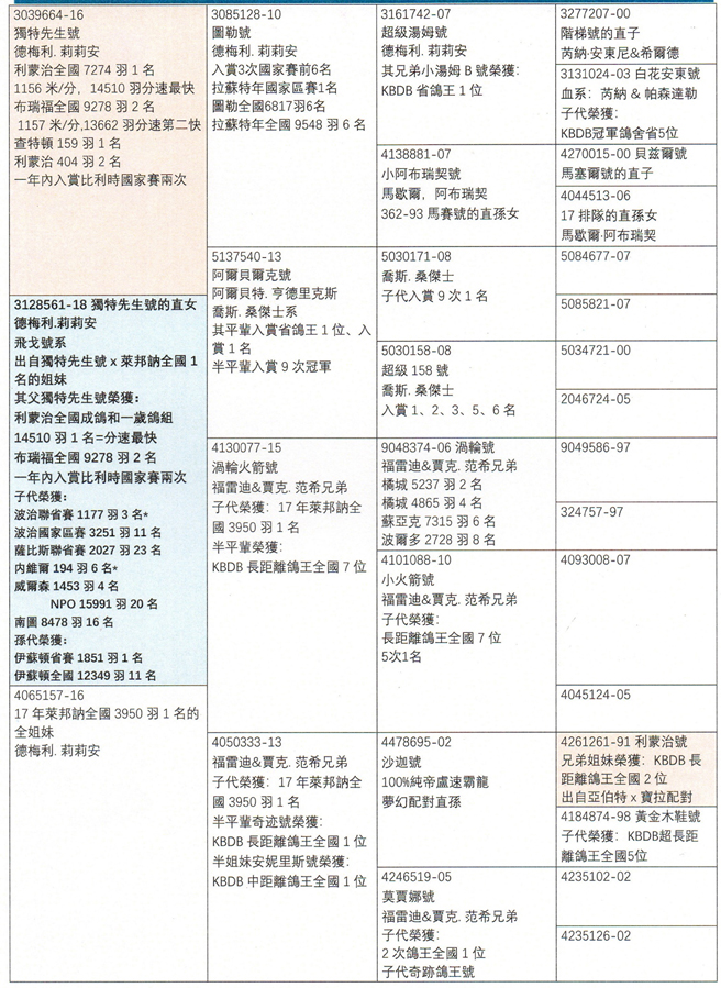 父鴿:B16-3039664灰公”獨特先生” 2018年利蒙治全國14.510羽冠軍,布瑞福13.662羽亞軍。