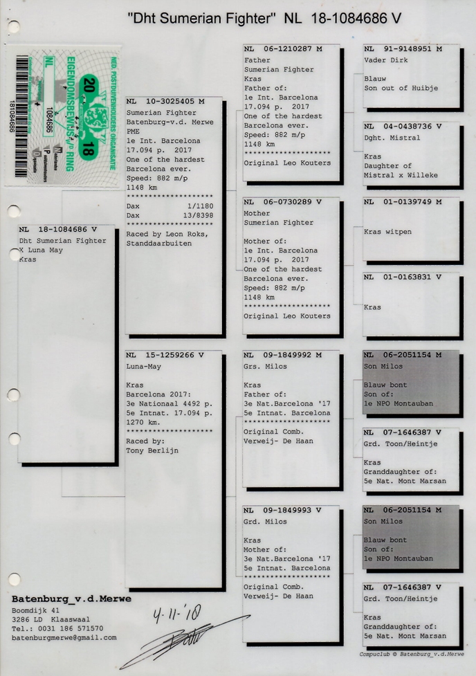 —母親「蘇美爾戰將之母」(裡奧.昆德斯)是「波品納號」孫女—「波品納號」獲得:波品納全國7,195羽40位波品納全國5,890羽75位