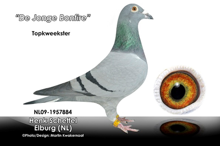 “年輕邦費爾”(Jonge Bonfire NL09-1957884),這羽特別的母鴿是漢克從住在韋爾(Wehl)的鴿友佛蘭斯.提曼門斯(Frans Timmermans)處引進的。
