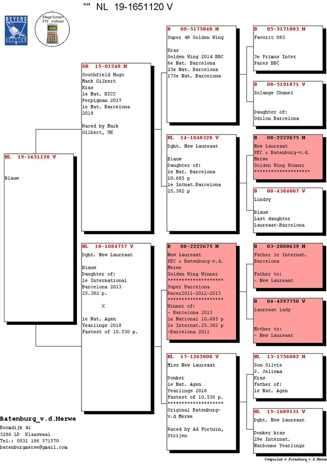 —其父親出自吉塞布賴特的傳奇大銘鴿“巴賽隆納榮耀號”B92-4428350灰白羽公的一羽直孫女,“巴賽隆納榮耀號”榮獲: