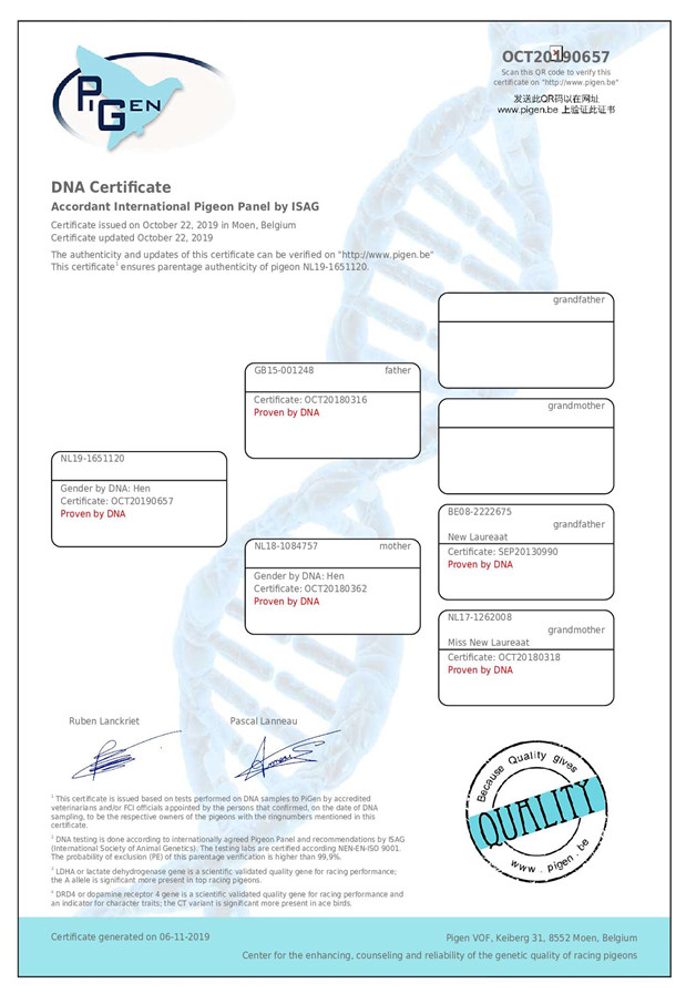 “新榮耀號120” NL19-1651120灰母 DNA檢驗證明書