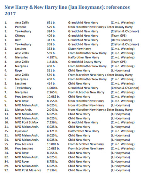 精心考慮的育種策略讓楊的超級賽鴿和種鴿“哈利”取得了眾多育種成績。截止目前“哈利”絕對是同樣的傳奇育種配對“年輕閃電號”X“迪克雌”的最重要後代。這對配對讓楊.胡曼斯享譽全世界。“哈利”為楊.胡曼斯成功賽鴿生涯寫下重要篇章:“哈利”憑藉布洛瓦37.728羽冠軍和查特路22.340羽冠軍獲得2009年WHZB全國22.340羽鴿王冠軍,他的子代和孫代取得的佳績多到無法盡數收集。僅僅2017年“哈利”的子代和孫代便贏得了27項冠軍(沒有重複)包括4項NPO冠軍和1項地區1全國冠軍。要知道這些都只是列出了2017年的成績。