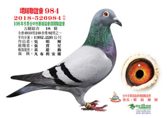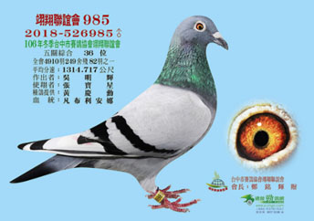 全弟鴿:NL14-1040494灰白羽.公,引進台灣第一孵即入賞2017年台中翊翔分會北海冬季4.910羽,五關結束全會剩下82羽,綜合18位、36位(同孵鴿),贏得全會最高獎金。