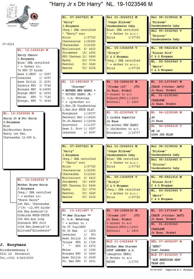 精心考慮的育種策略讓楊的超級賽鴿和種鴿“哈利”取得了眾多育種成績。截止目前“哈利”絕對是同樣的傳奇育種配對“年輕閃電號”X“迪克雌”的最重要後代。這對配對讓楊.胡曼斯享譽全世界。“哈利”為楊.胡曼斯成功賽鴿生涯寫下重要篇章:“哈利”憑藉布洛瓦37.728羽冠軍和查特路22.340羽冠軍獲得2009年WHZB全國22.340羽鴿王冠軍,他的子代和孫代取得的佳績多到無法盡數收集。僅僅2017年“哈利”的子代和孫代便贏得了27項冠軍(沒有重複)包括4項NPO冠軍和1項地區1全國冠軍。要知道這些都只是列出了2017年的成績。