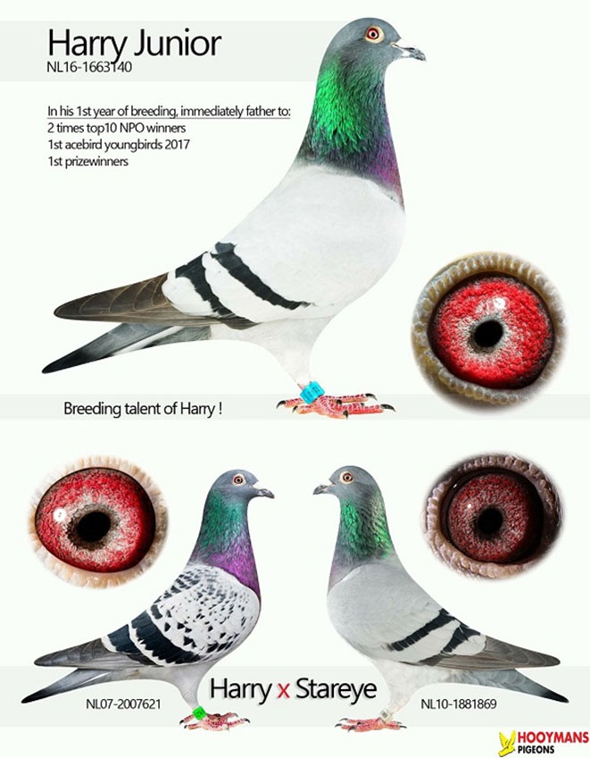 “小哈利”(NL2016-1663140灰公)是傑出種鴿“哈利”最新作育的後代。這羽超級鴿完美地體現了楊.胡曼斯的育種實力,我們將在本篇報導中為您詳細介紹。2017年“小哈利”第一年進入種鴿舍,便作育了不少於4羽取得佳績的子代。要知道這些幼鴿都是在不同鴿舍參賽的,這更加證明了他們的實力。讓我們看看他們的成績。