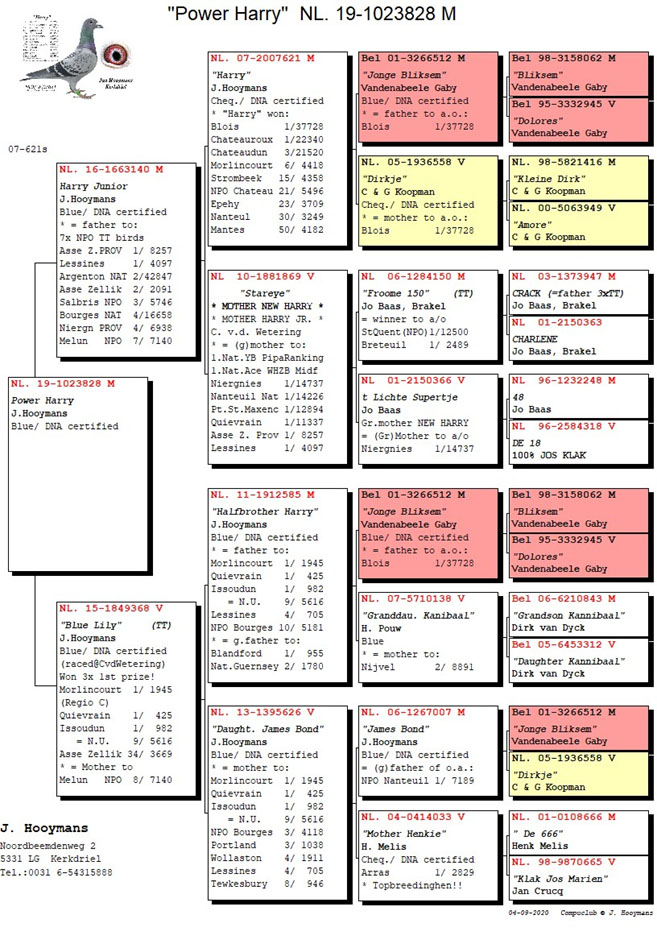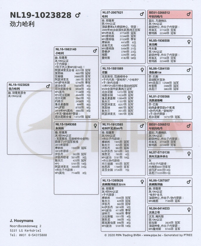 精心考慮的育種策略讓楊的超級賽鴿和種鴿“哈利”取得了眾多育種成績。截止目前“哈利”絕對是同樣的傳奇育種配對“年輕閃電號”X“迪克雌”的最重要後代。這對配對讓楊.胡曼斯享譽全世界。“哈利”為楊.胡曼斯成功賽鴿生涯寫下重要篇章:“哈利”憑藉布洛瓦37.728羽冠軍和查特路22.340羽冠軍獲得2009年WHZB全國22.340羽鴿王冠軍,他的子代和孫代取得的佳績多到無法盡數收集。僅僅2017年“哈利”的子代和孫代便贏得了27項冠軍(沒有重複)包括4項NPO冠軍和1項地區1全國冠軍。要知道這些都只是列出了2017年的成績。