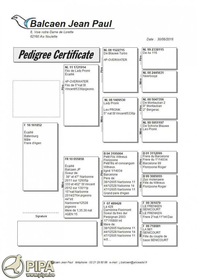 獲得阿讓國際賽成鴿組13.325羽冠軍為法國巴甘恩.楊-保羅(Balcaen Jean-Paul)鴿舍,也是總數24.897羽(成鴿+一歲鴿)總冠軍鴿,該舍冠軍鴿B16-161852斑公,是在比利時時間6月29日(星期五)晚上20時10分7秒歸巢,翔距737.665公里,創下平均分速1009.65米/分,唯一分速破1000米/分的冠軍鴿。
